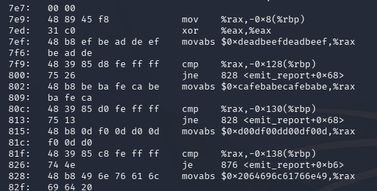 Disassembling emit_report revealed the condition to getting the flag. The function checks three 64-bit arguments and only proceeds if they match “magic” constants.
