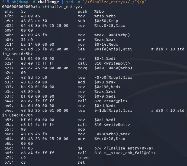 objdump -d -Mintel ./challenge | sed -n '/<finalize_entry>:/,/^$/p'
