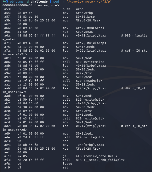 objdump -d -Mintel ./challenge | sed -n '/<review_note>:/,/^$/p'
