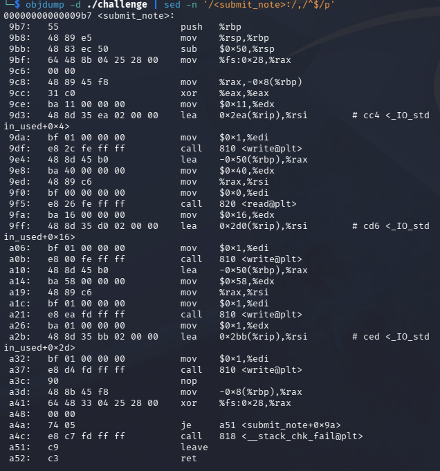 objdump -d -Mintel ./challenge | sed -n '/<submit_note>:/,/^$/p'