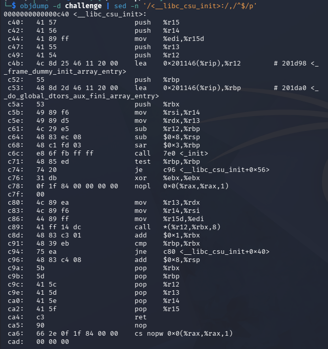 The ret2csu sequence needs a function call (call [r12 + rbx*8]). I used .init_array as the function pointer table and called the first entry (frame_dummy) by setting: